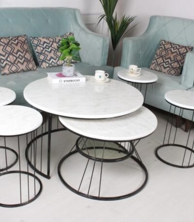 طقم طاولتين لون أسود مع 4 طاولات صغيرة خدمة بسطح خشب لون أبيض شبيه الرخام + زجاج