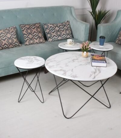 تصميم أنيق وعصري: يتميز طقم الطاولات بتصميمه العصري والأنيق، مع خطوط مستقيمة وألوان هادئة، مما يجعله قطعة أثاث جذابة تُضفي