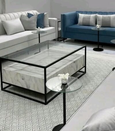**وصف المنتج: طقم طاولات حديد وبديل الرخام مع الزجاج**   **المقدمة:** تعزز طقم الطاولات المصمم بشكل أنيق ومميز من أجواء