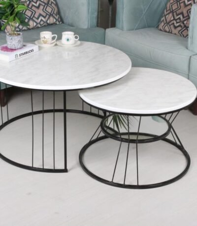 طقم طاولات أسود قطعتين سطح أبيض بديل الرخام
