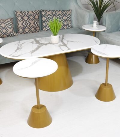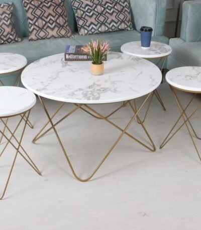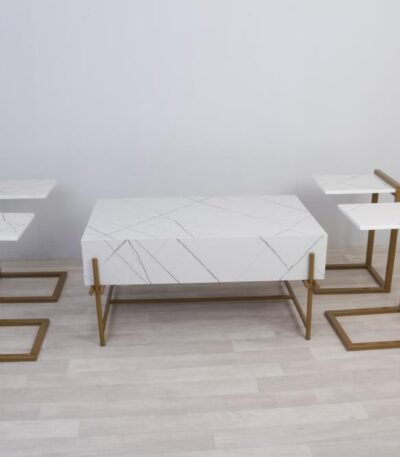 طقم طاولة لون ذهبي والسطح خشب أبيض شبيه الرخام مع 4 طاولات صغيرة خدمة
