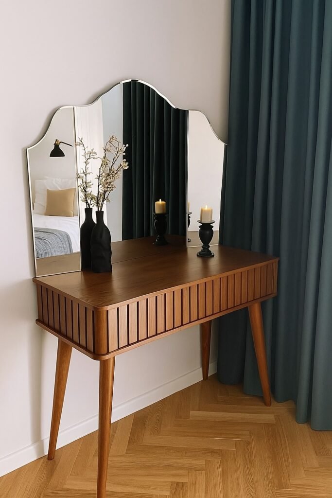 تسريحة خشب مع مرآة هي قطعة أثاث أنيقة وعملية تُستخدم في غرف النوم