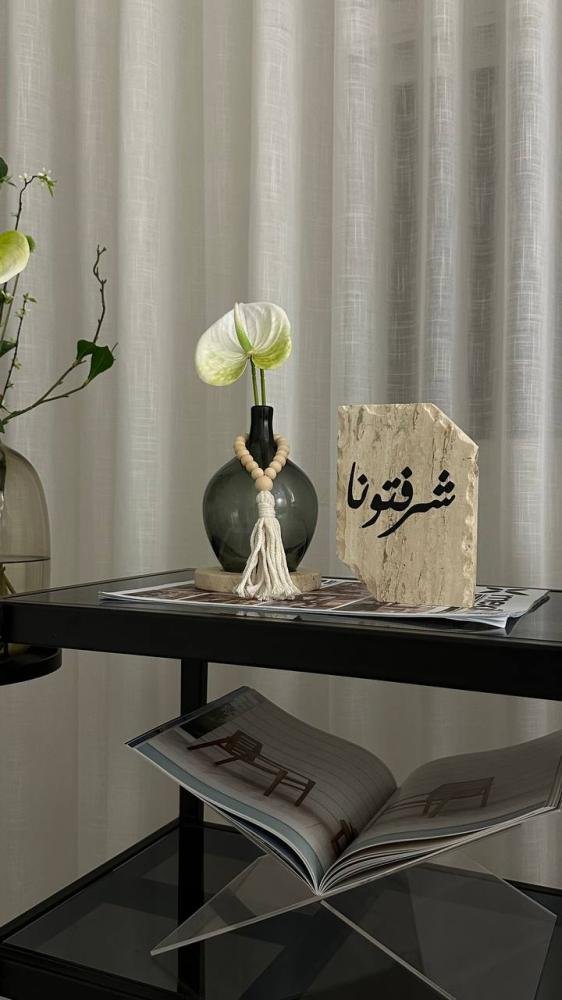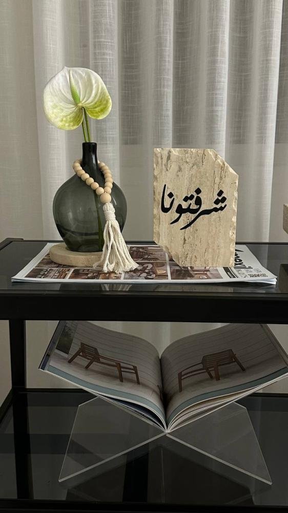 - قطعة صغيرة من رخام ترافنتينو تحمل عبارة ترحيبية، مصممة للجلوس على سطح المكتب أو عند مدخل المنزل.